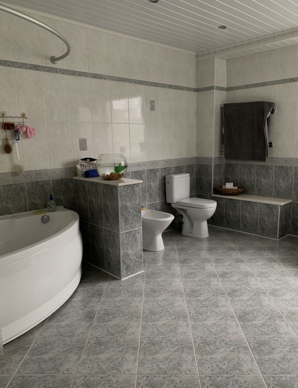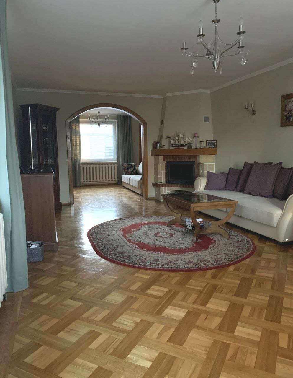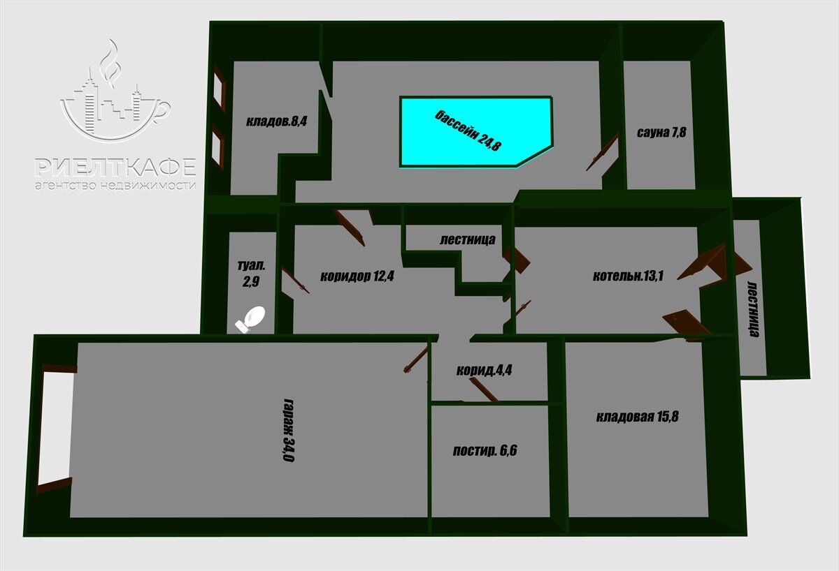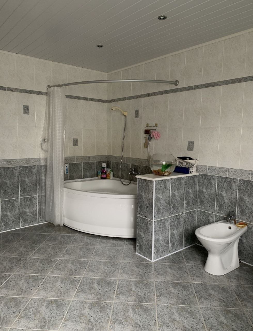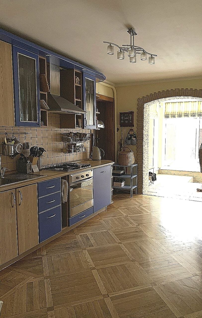- 1-й этаж: кухня, столовая, камин, 3 комнаты, совмещенный санузел; 2-й этаж - 5 жилых комнат, санузел, терраса; цокольный этаж-бассейн, сауна, комната отдыха, туалет, прачечная, 2 кладовые, котельная и гараж,